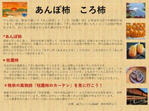 干し柿には、製法の違いで「あんぽ柿」と「ころ(枯露)柿」と呼ばれる2つの種類があります。歴史的にも奈良時代の正倉院文書に「干し柿を売り買いした」という記録が残されており、古くから珍重されて来た事が分かります。