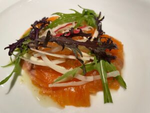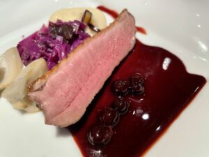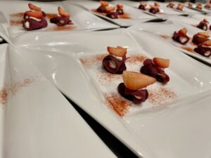 鹿肉のハム・ビーツのピュレ・フロマージュブランのムース・苺のマリネ
