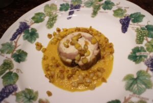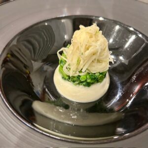 ホロホロ鶏の低温調理とおっとうふを添えたグリーンピースのヴルーテ