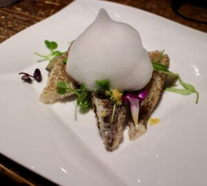 ニジマスとサトイモのブランダード風 クロケット仕立て リンゴ風味のブールブランソース