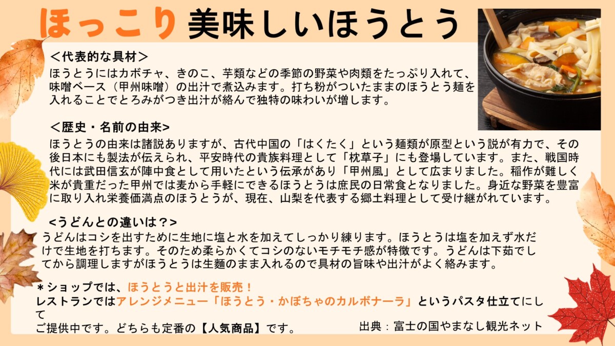 ほうとうにはカボチャ、きのこ、芋類などの季節の野菜や肉類をたっぷり入れて、味噌ベース(甲州味噌)の出汁で煮込みます。打ち粉がついたままのほうとう麺を入れることでとろみがつき出汁が絡んで独特の味わいが増します。