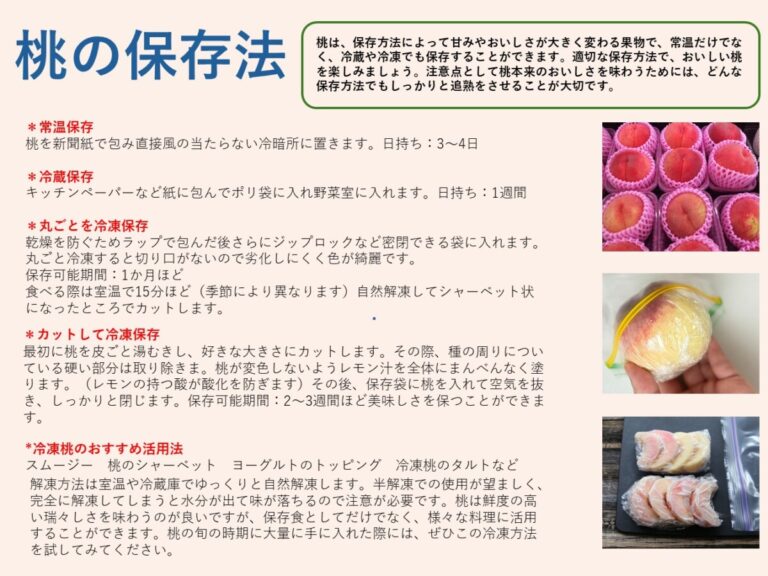 桃は、保存方法によって甘みやおいしさが大きく変わる果物で、常温だけでなく、冷蔵や冷凍でも保存することができます。適切な保存方法で、おいしい桃を楽しみましょう。注意点として桃本来のおいしさを味わうためには、どんな保存方法でもしっかりと追熟をさせることが大切です。